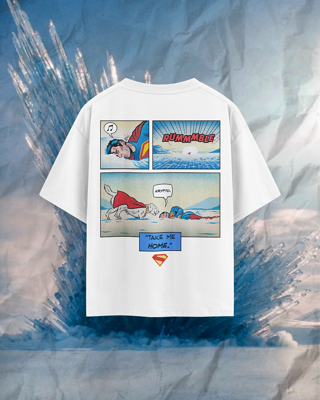 This tee captures a quiet moment from the 2025 Superman reboot. It shows Kal-El lying in the snow, worn out, with Krypto by his side — and those three words in the corner: “Take me home.”
